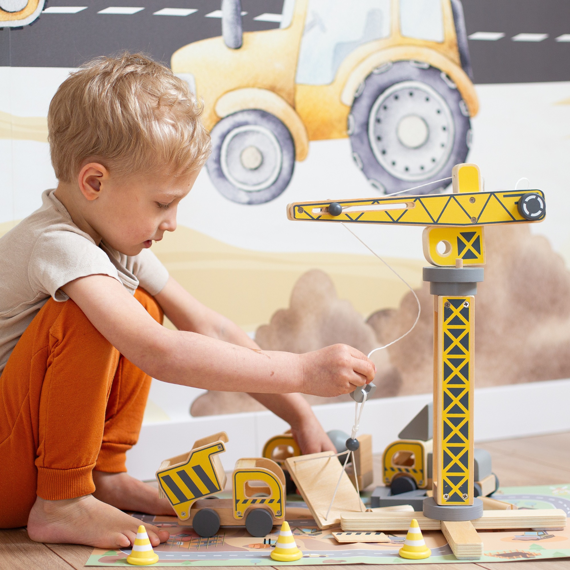 Devenir un constructeur de bâtiments est le rêve de nombreux enfants en bas âge. Le chantier en bois avec de nombreux éléments pour un jeu imaginatif les aidera à réaliser ce rêve. Le set comprend, entre autres, une grue géante qui tourne et soulève les matériaux de construction sur une plate-forme spéciale. Les véhicules finement finis se déplacent sur une plate-forme spéciale, imitant un chantier de construction. L'ensemble est complété par des barrages routiers et des bornes pour avertir les passants.