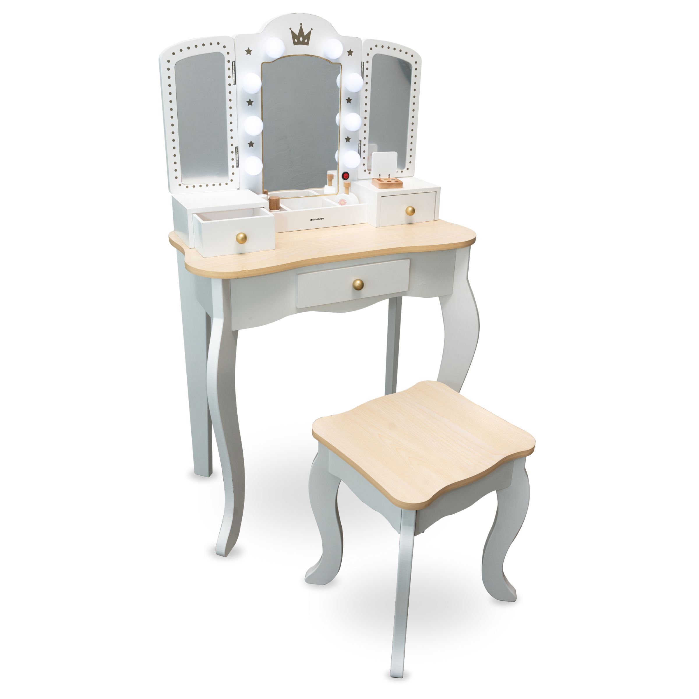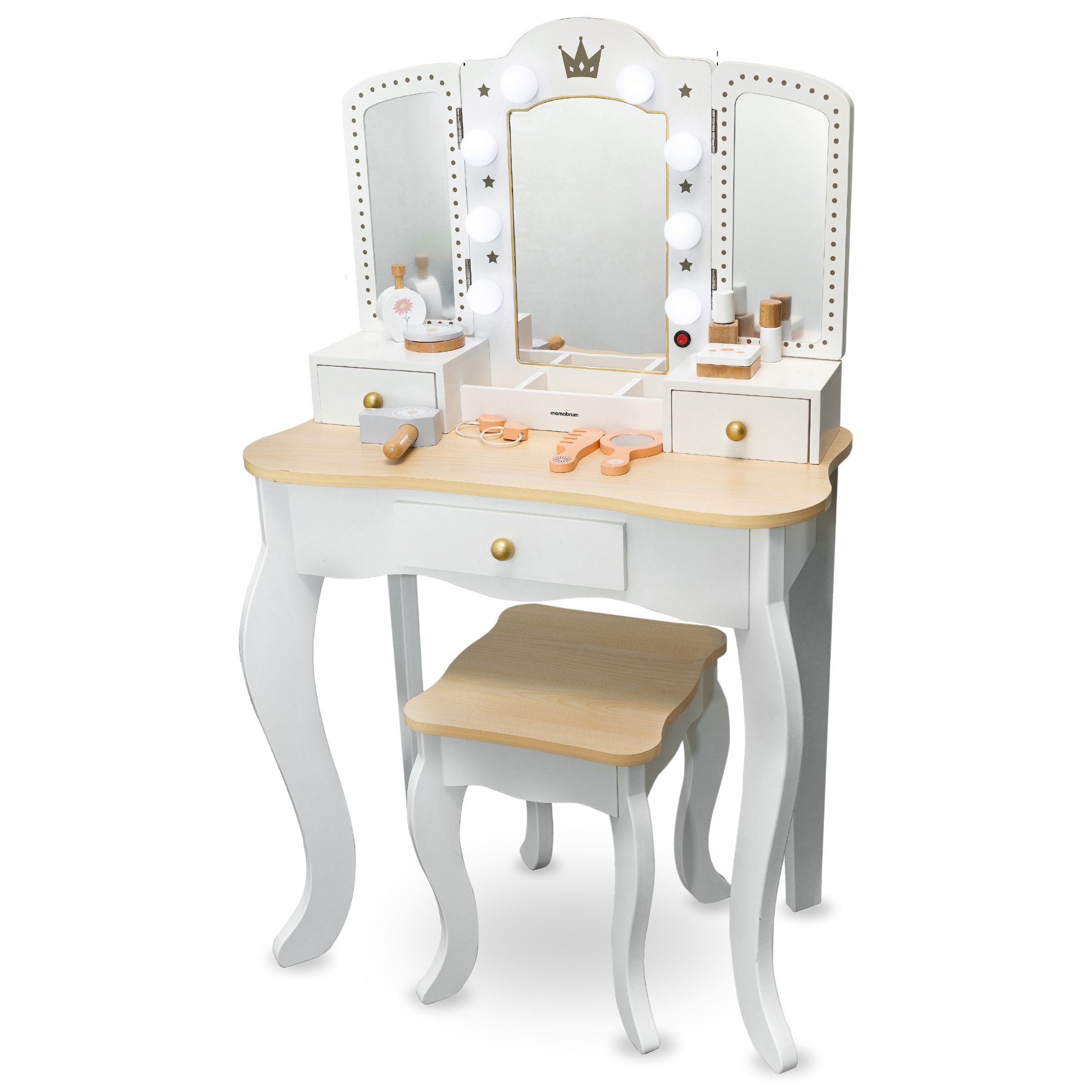 Coiffeuse XXL en bois avec tabouret et éclairage LED pour enfants + accessoires