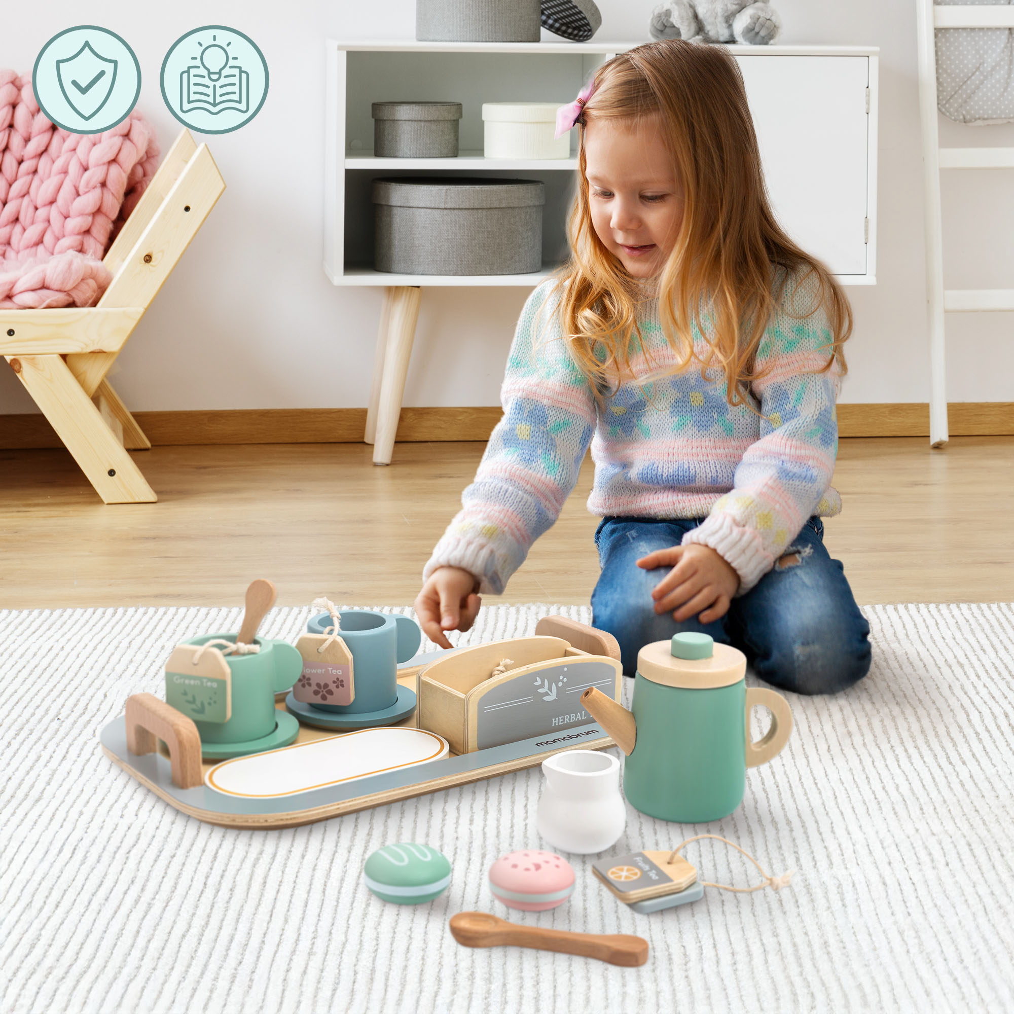 Ce set a été créé pour les enfants qui aiment créer leurs propres scénarios. Faire infuser le thé, disposer les tasses et inventer des histoires transforme chaque moment de jeu en une petite aventure.