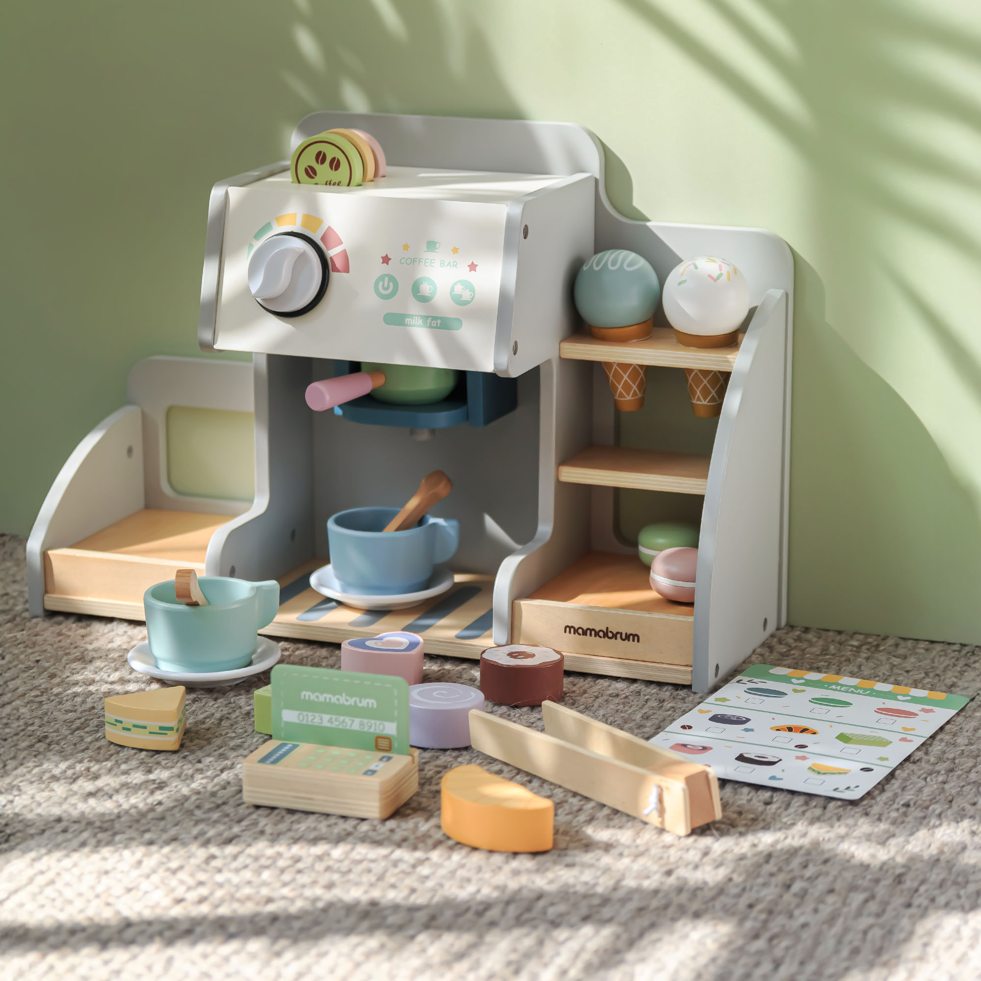 Équipé de nombreux accessoires, le café est une recette pour un divertissement créatif. L'ensemble stimule l'imagination des enfants et s'intègre parfaitement dans le décor d'une chambre d'enfant grâce à ses couleurs douces et à son design moderne. Fabriqué en bois naturel, le jouet favorise le développement des compétences sociales, motrices et cognitives des tout-petits. Grâce à une variété d'éléments et à des fonctions réalistes, comme le clic de la machine à café, le jeu peut être différent à chaque fois.
