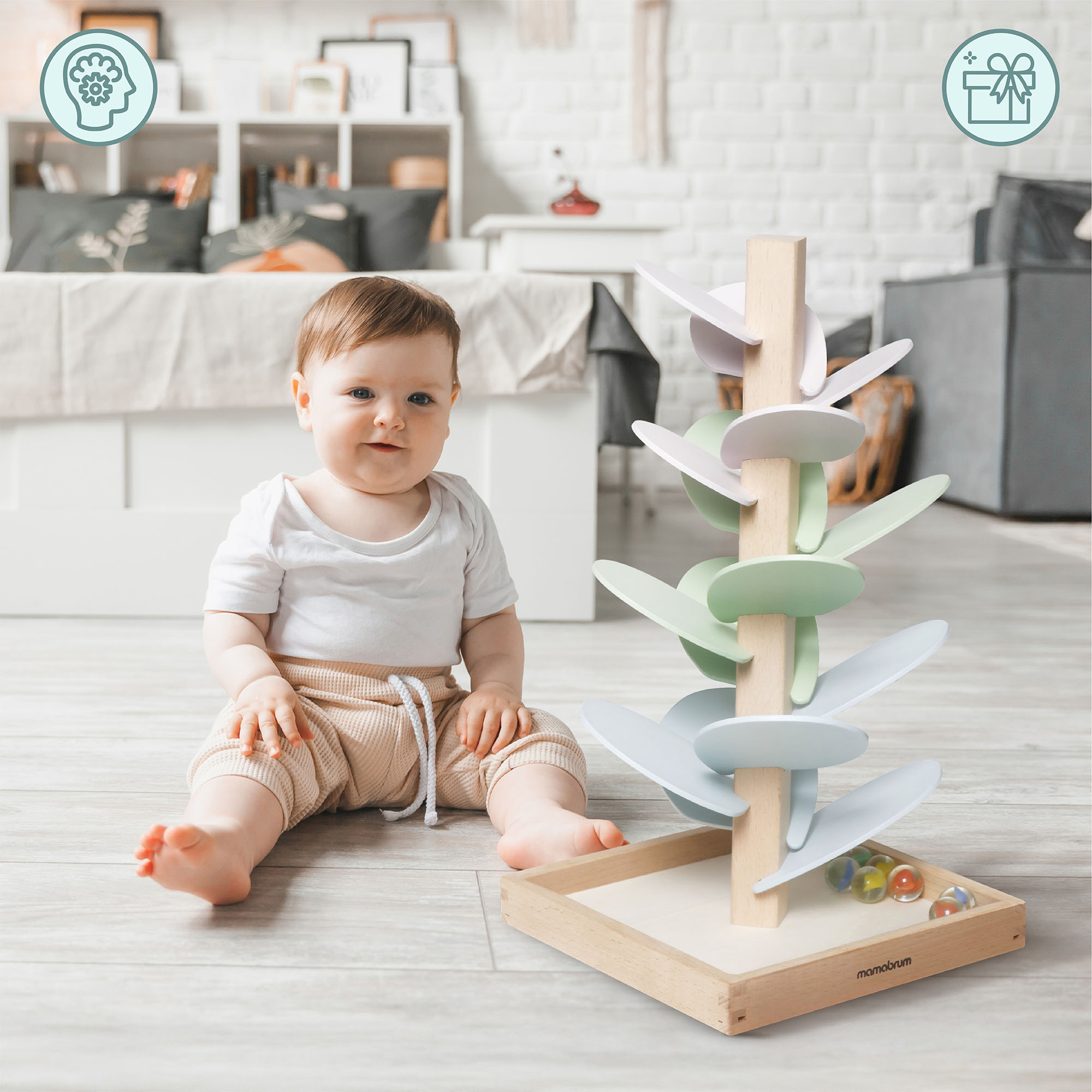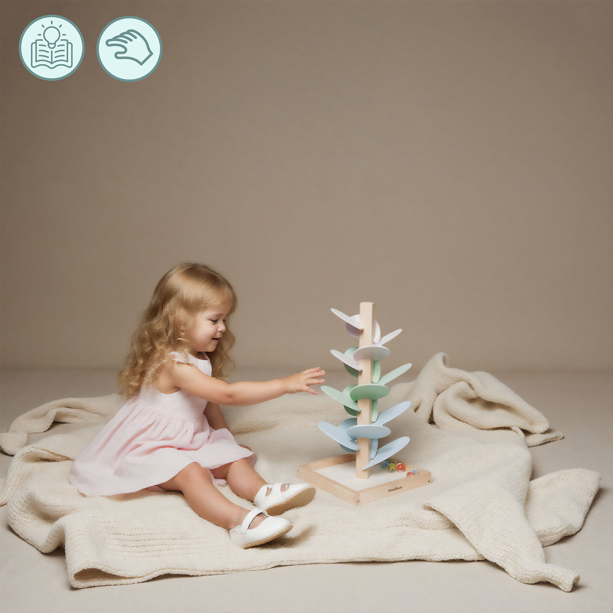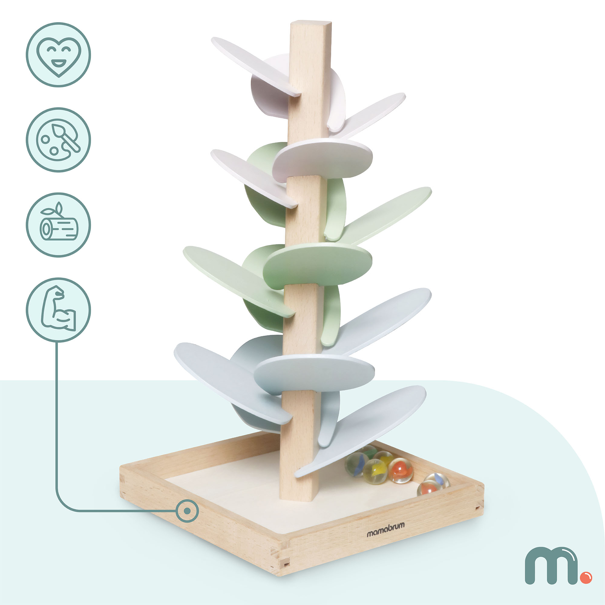 Ce jouet extraordinaire transporte votre enfant dans un monde de couleurs et de sons ! Il suffit de placer la balle au sommet de l'arbre et de la regarder rouler feuille après feuille en produisant des sons rythmés et enchanteurs. Ce n'est pas seulement une source d'amusement, mais aussi un excellent exercice pour les petites mains, les sens et l'imagination de votre enfant. Cette combinaison favorise le développement de l'enfant d'une manière naturelle et attrayante.