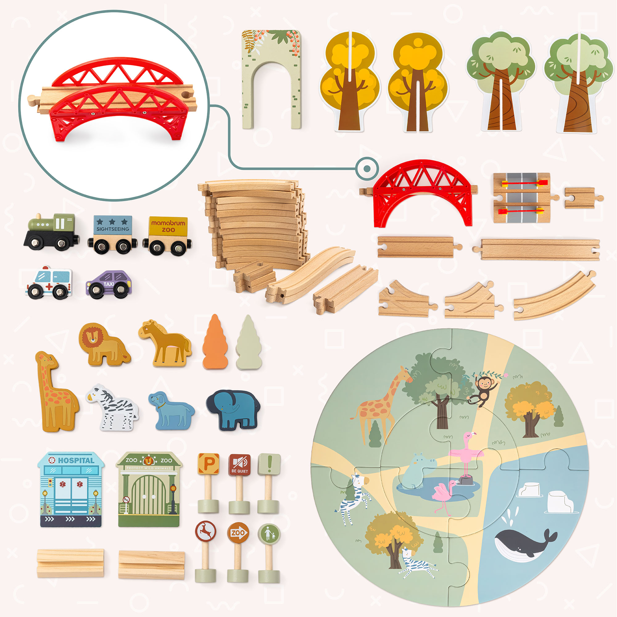 Train ZOO en bois - puzzle, train, rails, animaux, pont, barrière