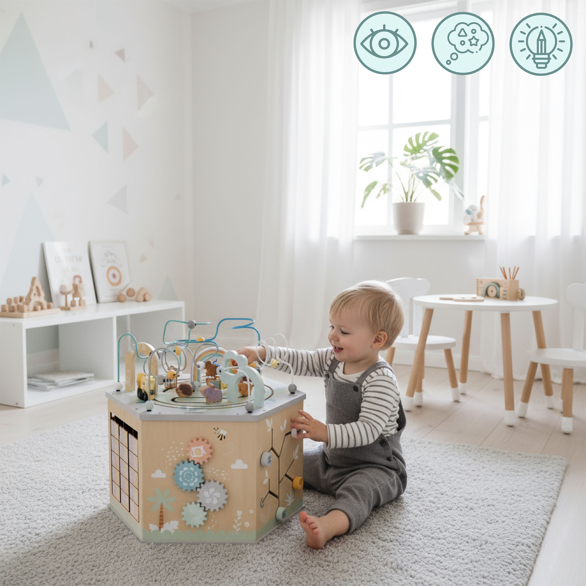 Ce cube éducatif est un véritable pôle de développement : chaque activité stimule différentes compétences chez les enfants . L'horloge enseigne les premières notions de temps, l'alphabet et 26 mots anglais développent le langage, et les engrenages et les tuiles animaux stimulent la curiosité et la logique . Le trieur de formes, les labyrinthes de manipulation et les boucles motrices développent la dextérité manuelle , la patience et la coordination . Les tunnels colorés, les figurines et le train animalier stimulent l'imagination et la créativité. Grâce à cette diversité, les enfants apprennent et jouent simultanément, découvrant le monde à plusieurs niveaux.