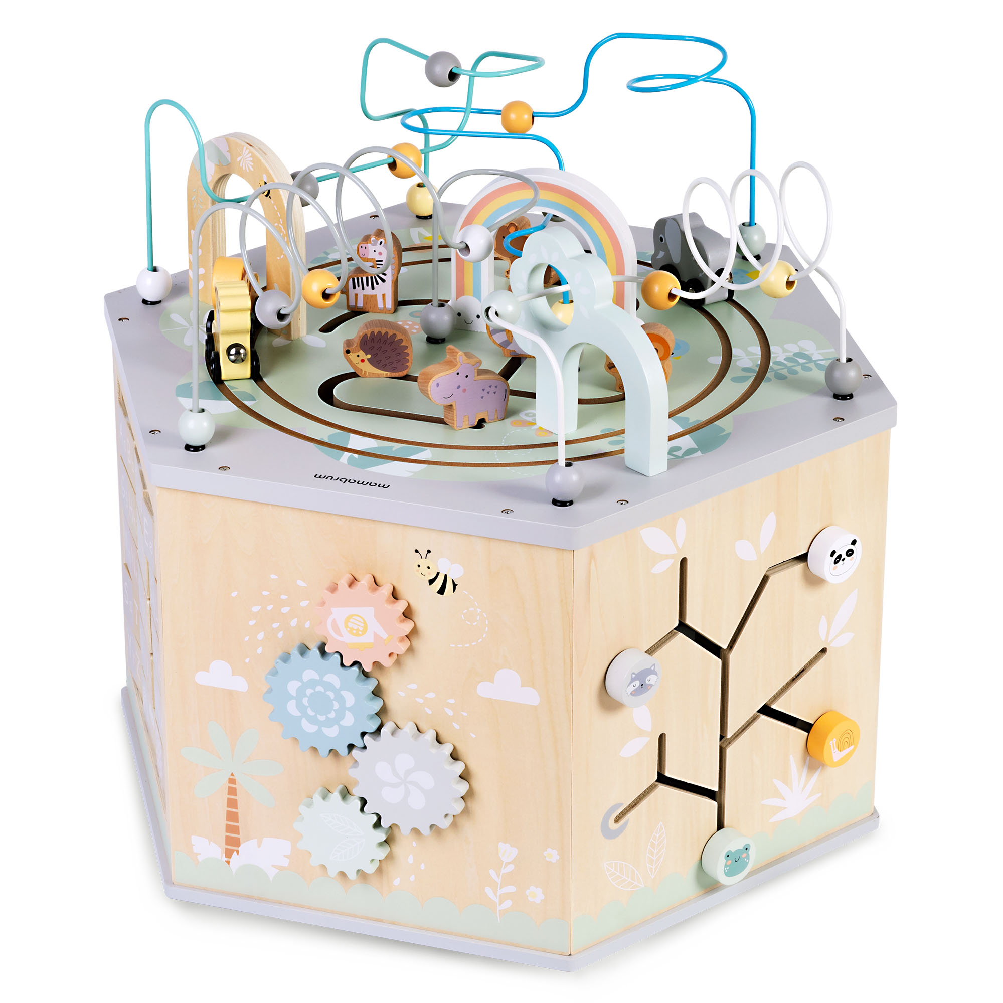 Offrez à votre enfant un jouet qui le ravira par sa diversité et l'occupera pendant des heures ! Ce grand cube éducatif multifonctionnel est un véritable centre d'activités qui favorise le développement de votre enfant par le jeu. Chaque face a une tâche différente : déplacer des perles, associer des formes, faire tourner des engrenages. Des couleurs douces, des animaux adorables et des illustrations sympathiques font de ce cube non seulement un jouet, mais aussi un élément décoratif pour la chambre d'enfant .