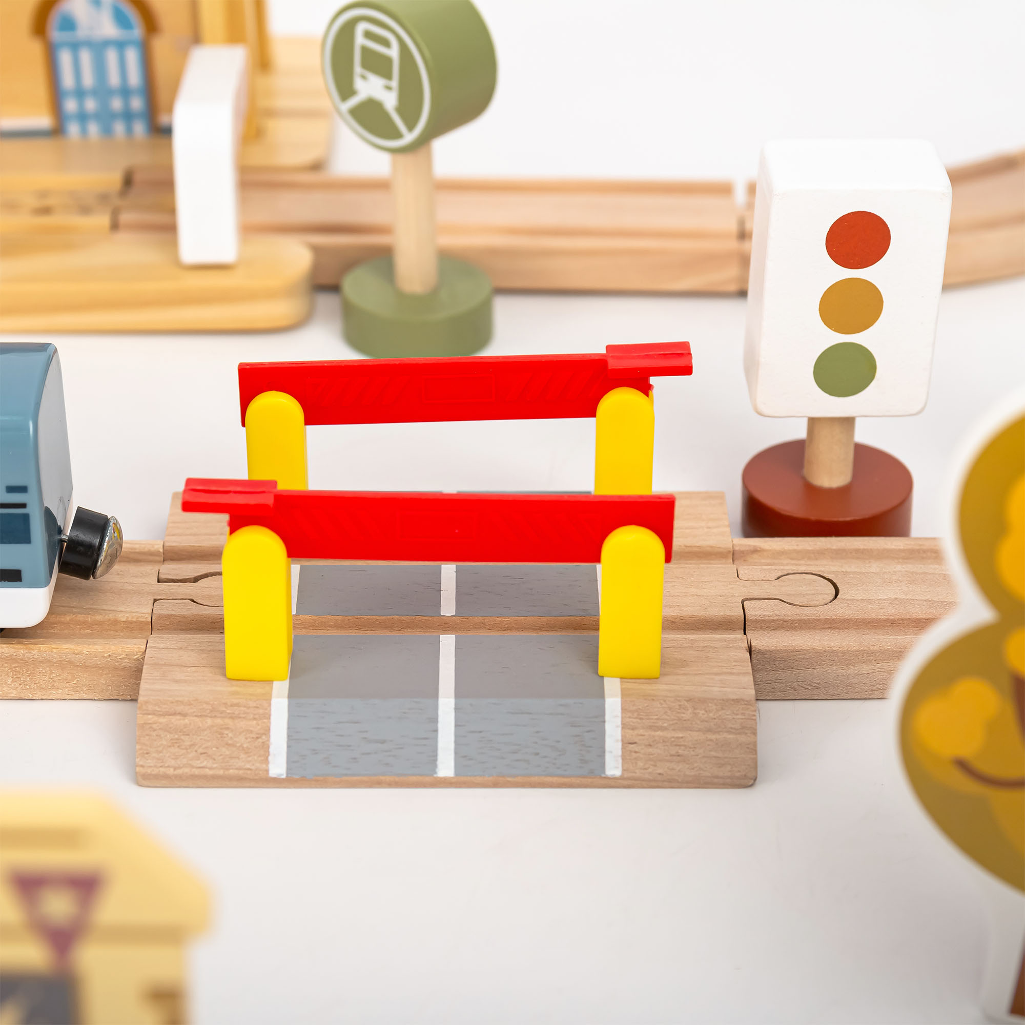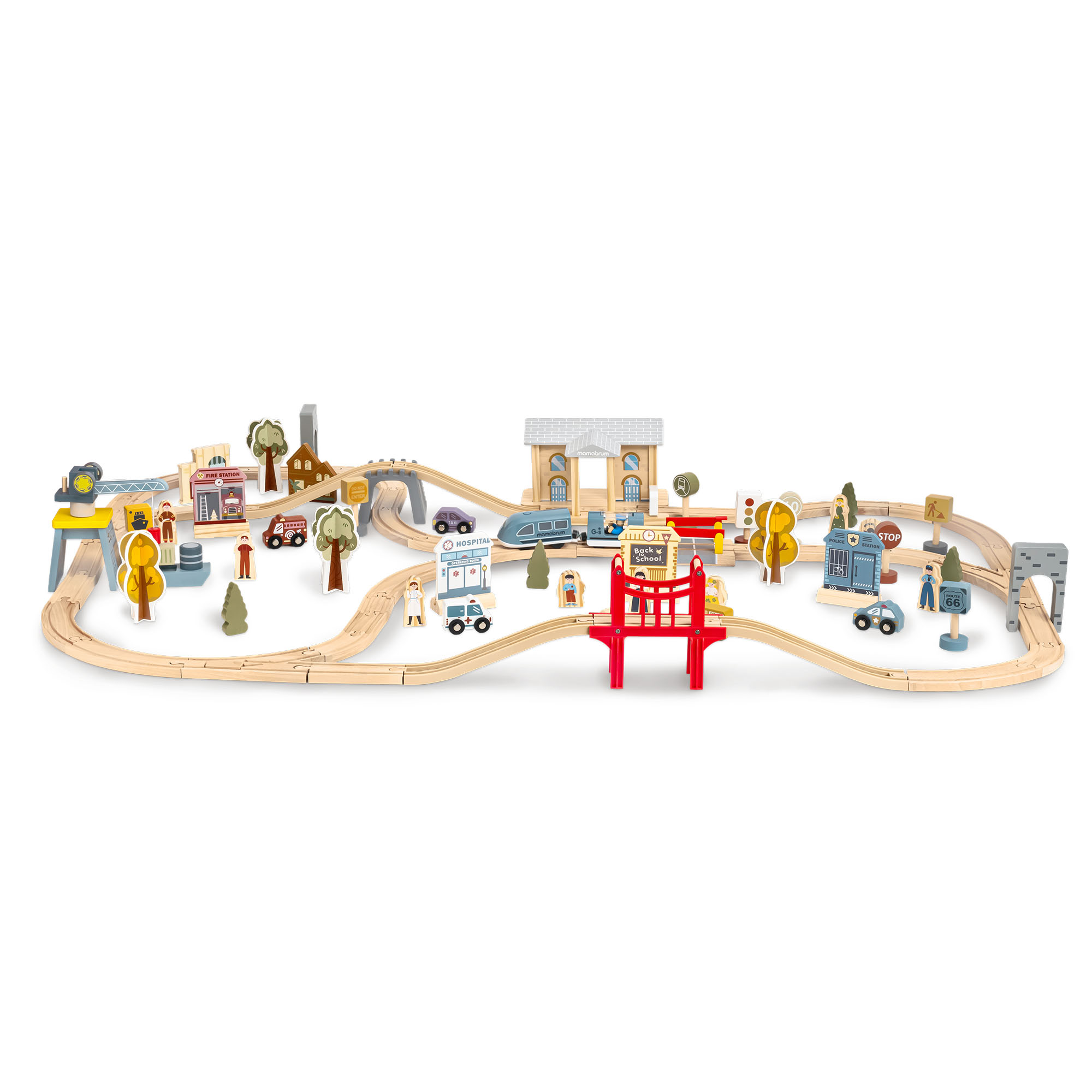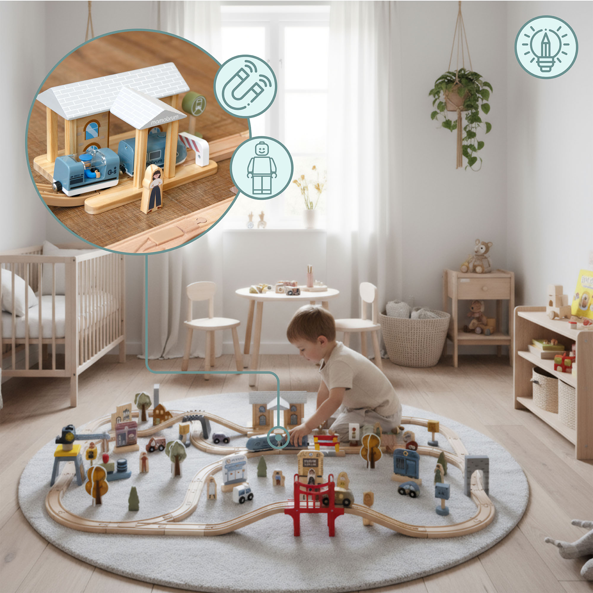 Transportez votre enfant dans une ville animée et pleine d'aventures ! Ce circuit de train en bois est un ensemble complet qui impressionne par le nombre de pièces, la qualité de sa fabrication et son ingéniosité.
