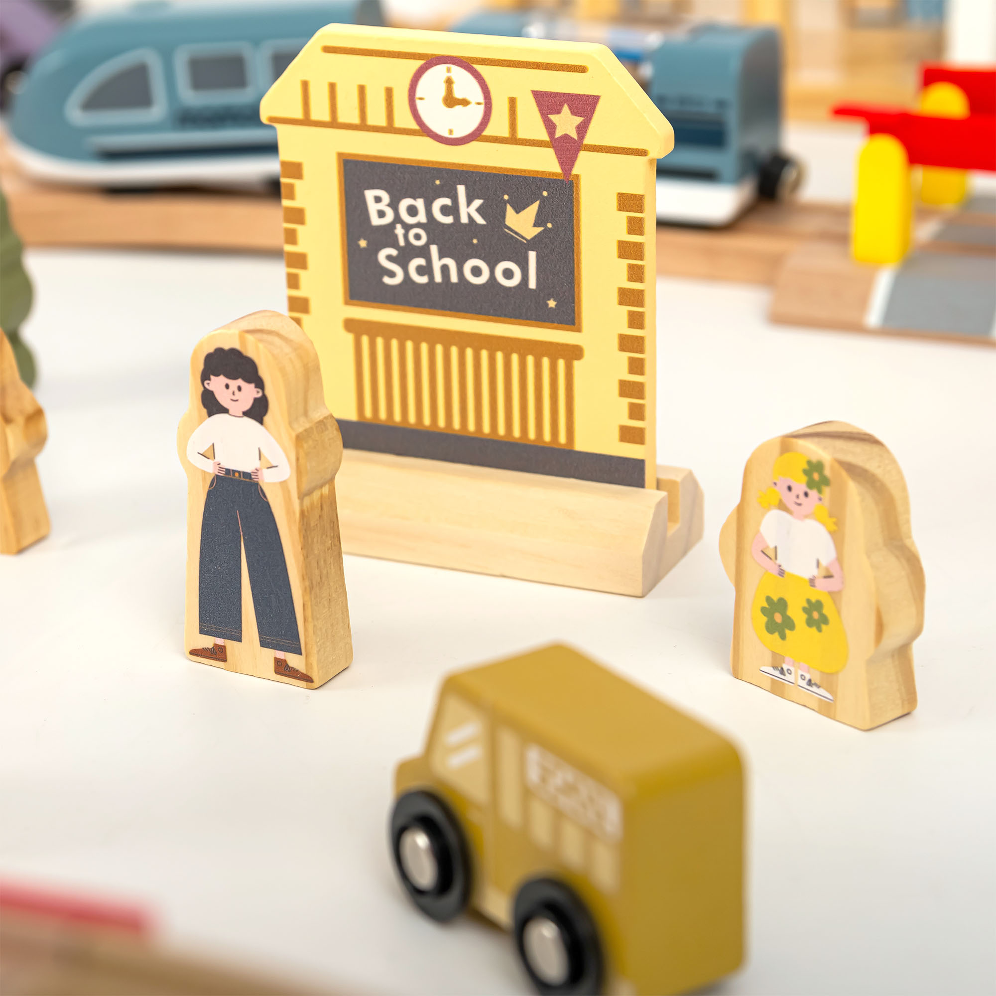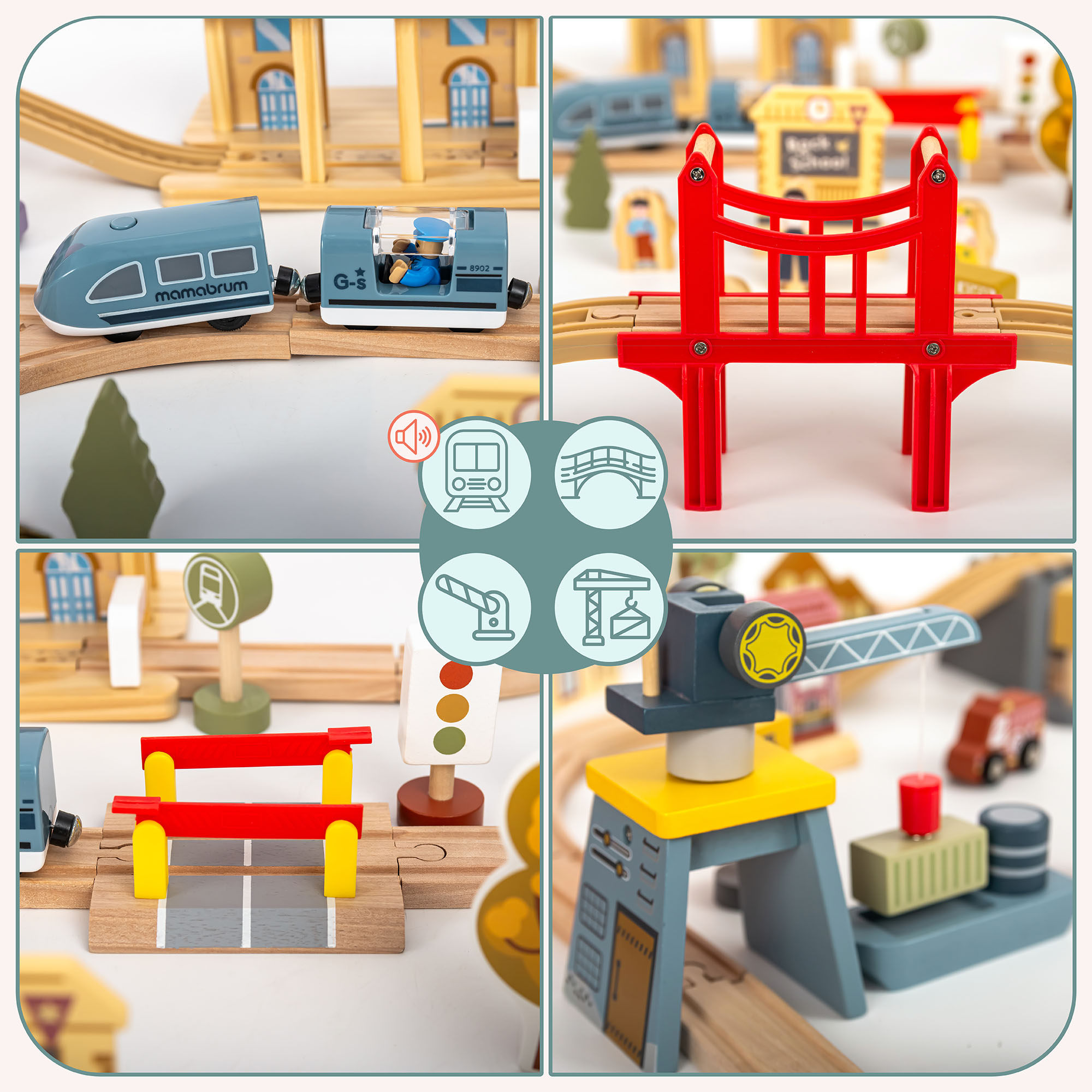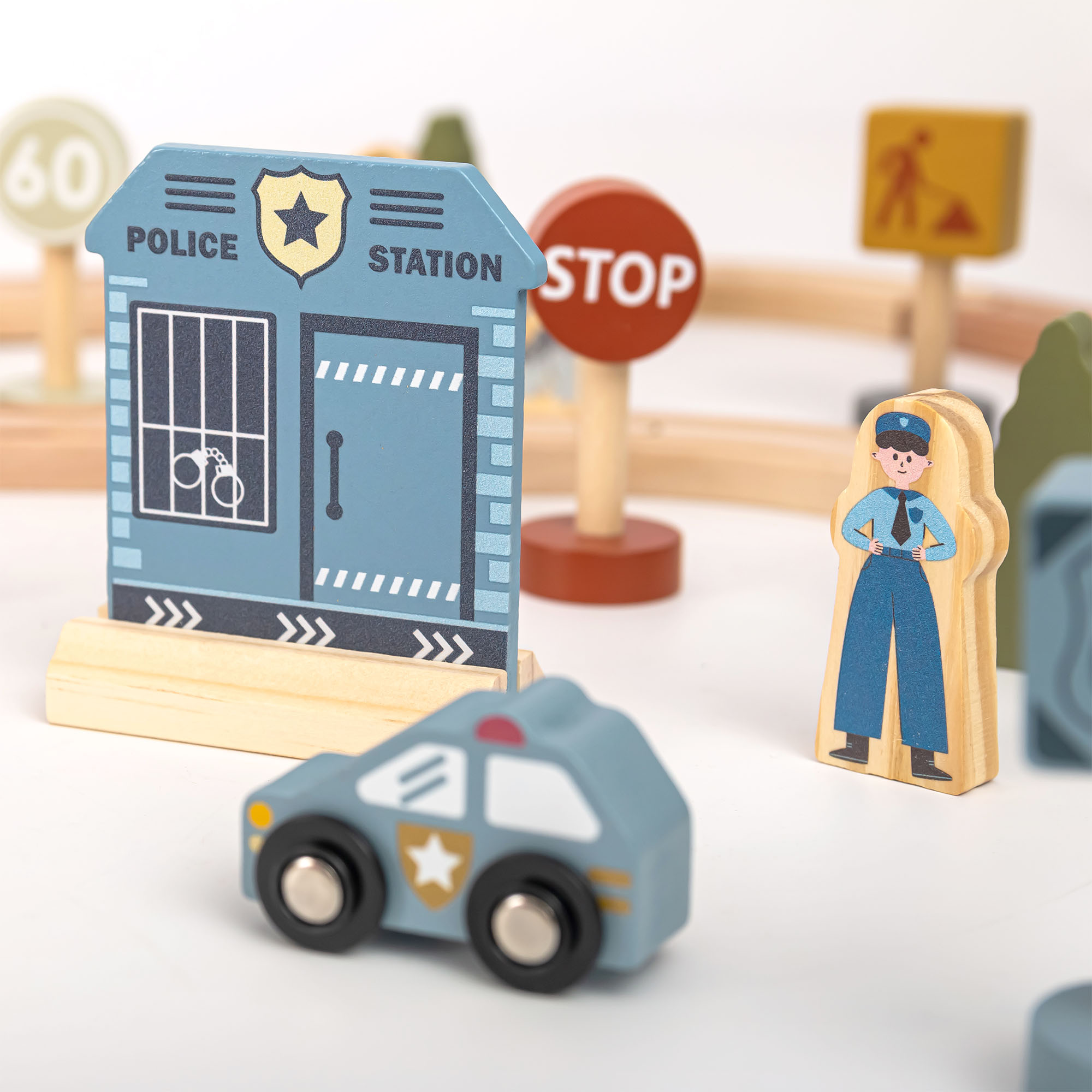 Transportez votre enfant dans une ville animée et pleine d'aventures ! Ce circuit de train en bois est un ensemble complet qui impressionne par le nombre de pièces, la qualité de sa fabrication et son ingéniosité.