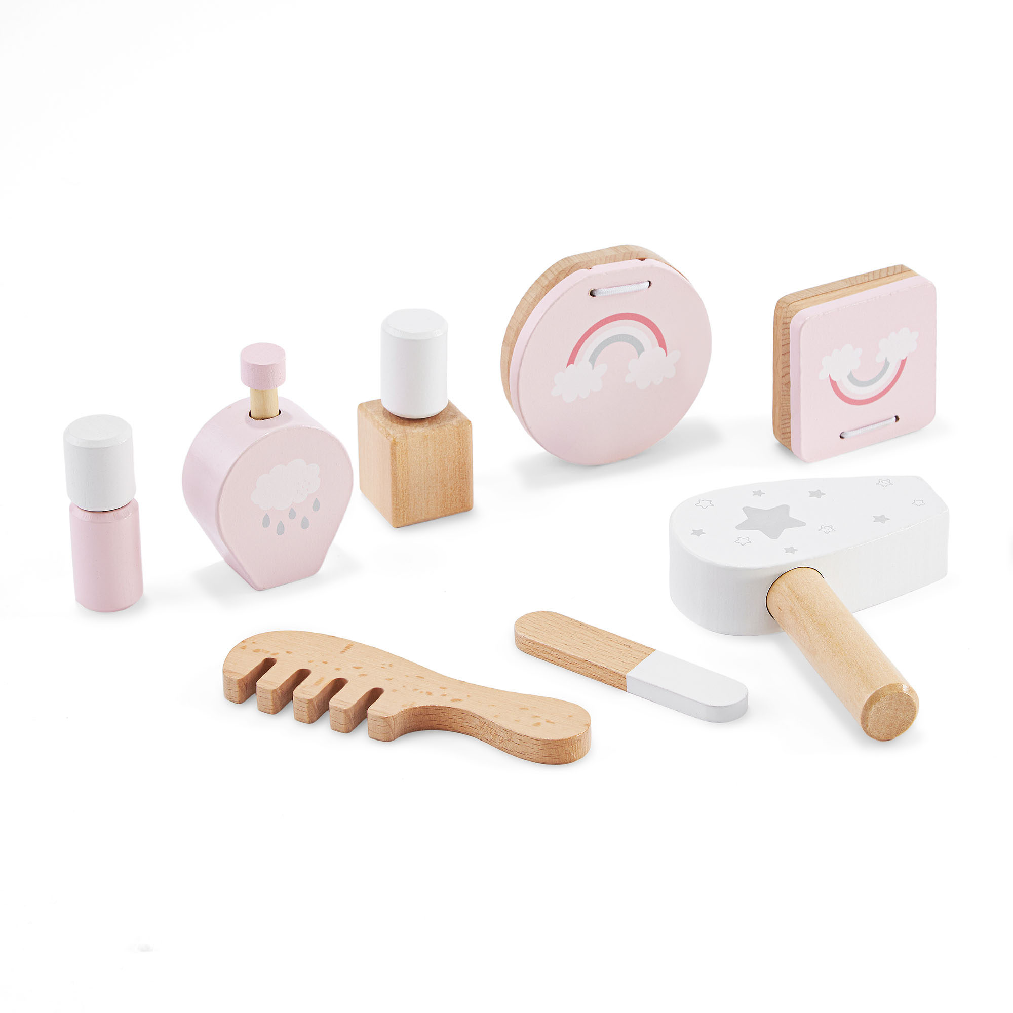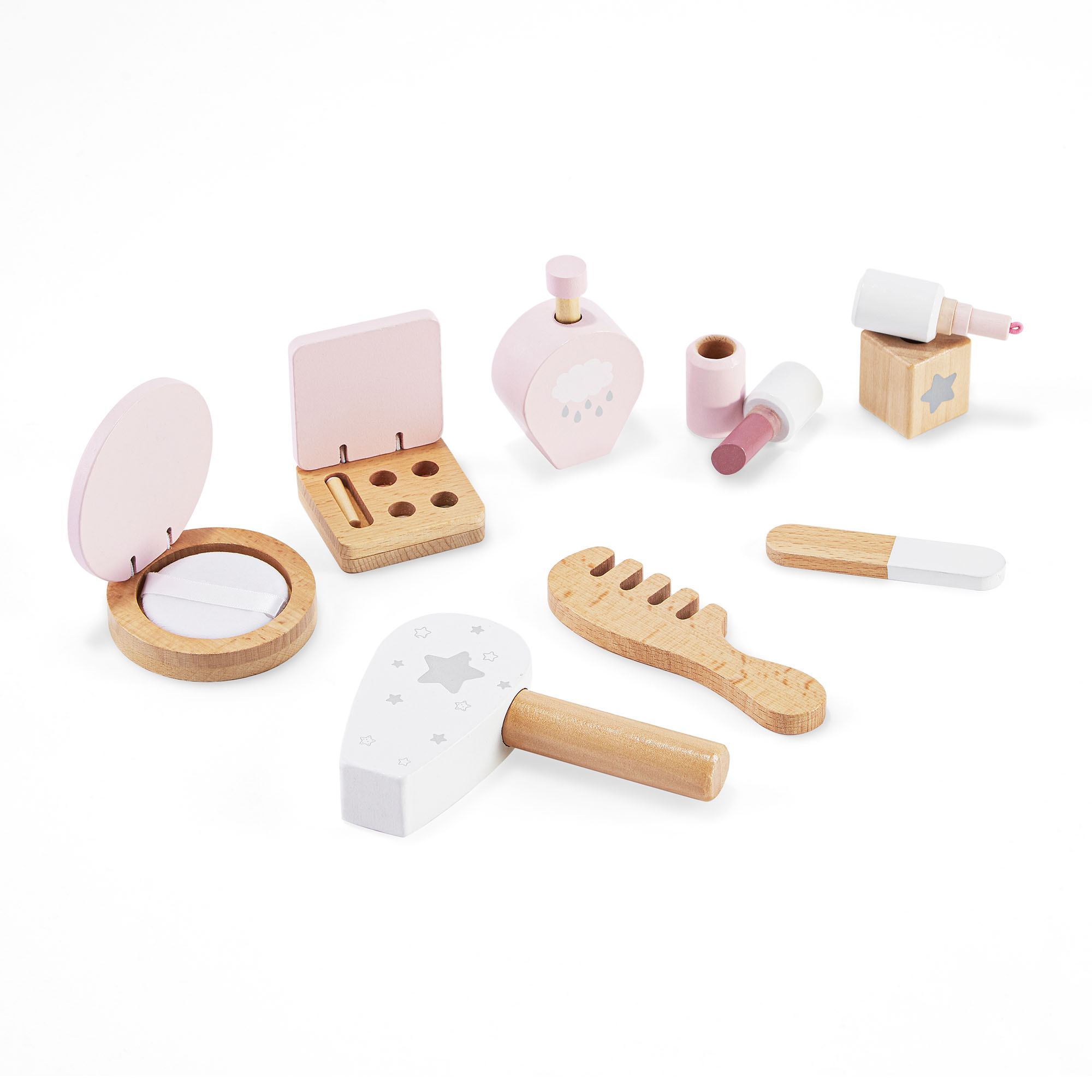 L'ensemble contient jusqu'à 8 accessoires en bois qui imitent de véritables outils cosmétiques : une palette de fards à paupières, du vernis à ongles, du parfum, de la poudre, un peigne à cheveux, un sèche-cheveux, du rouge à lèvres et une lime à ongles.