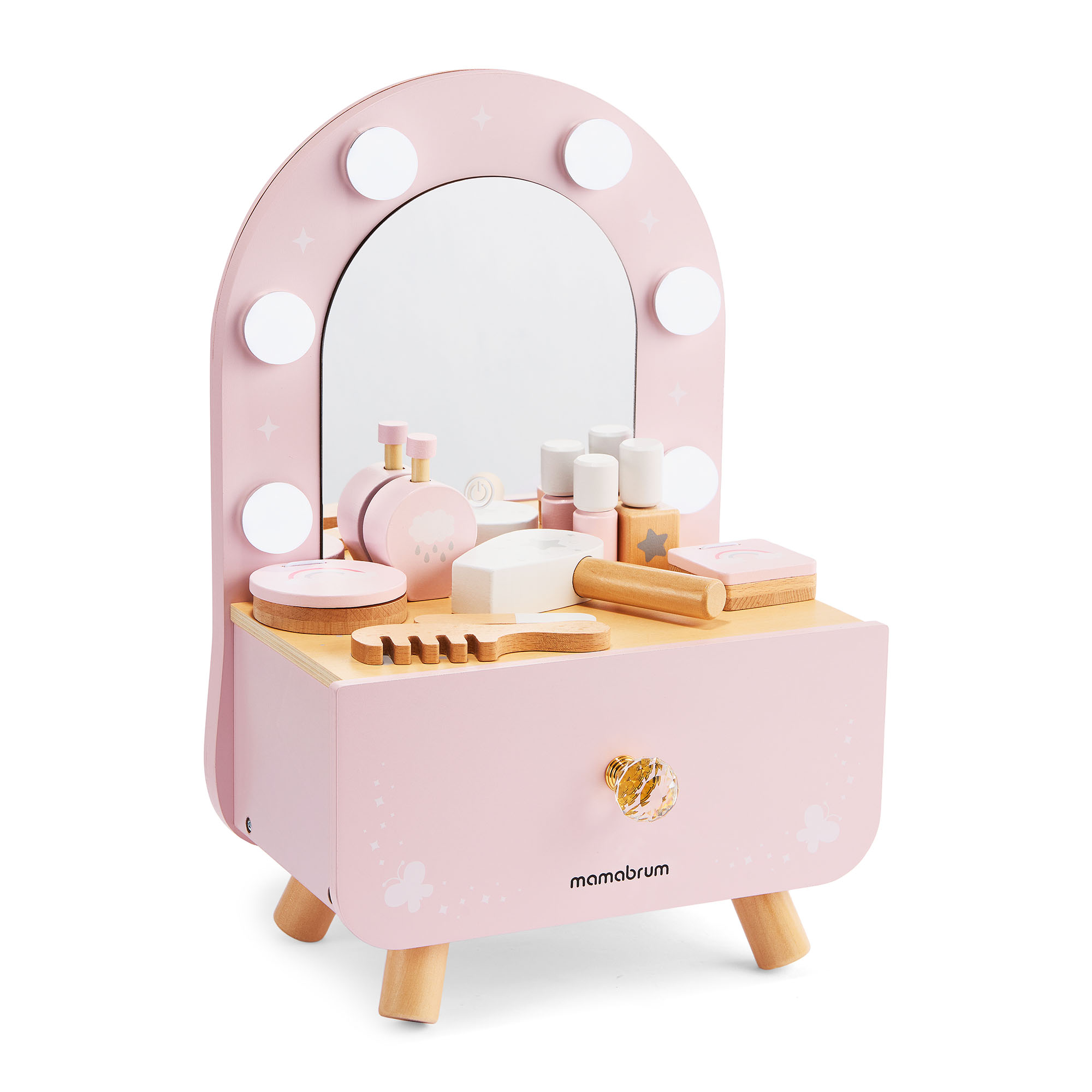 Ce charmant petit meuble allie élégance, fonctionnalité et sécurité. Idéal pour les enfants qui aiment imiter les adultes et créer leurs propres rituels de beauté magiques. Avec son éclairage LED intégré, ses accessoires réalistes et son format compact, il apporte une touche de féerie à la chambre d'enfant, où que son propriétaire aille.