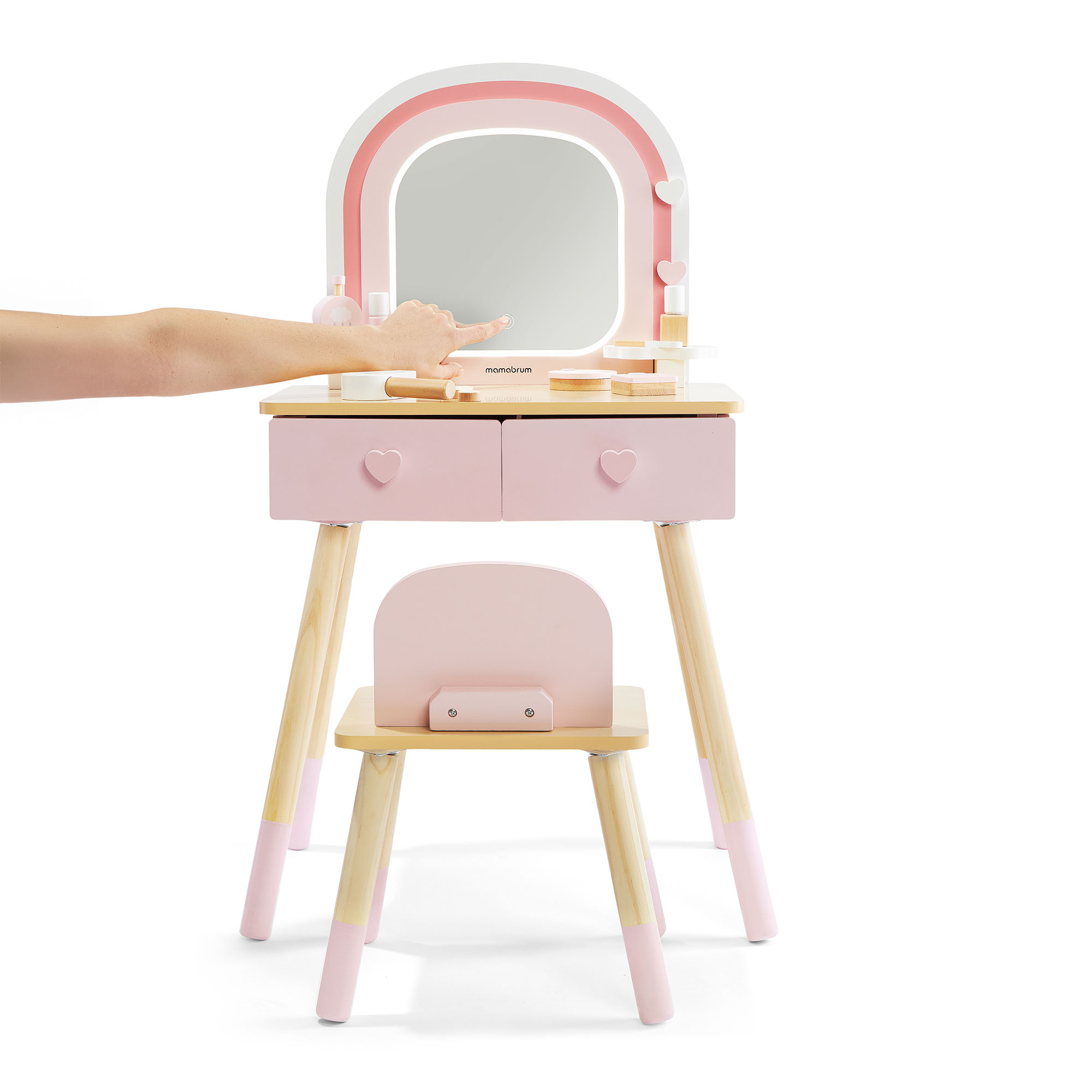 Coiffeuse en bois pour enfants avec éclairage LED à luminosité réglable, chaise et accessoires inclus.
