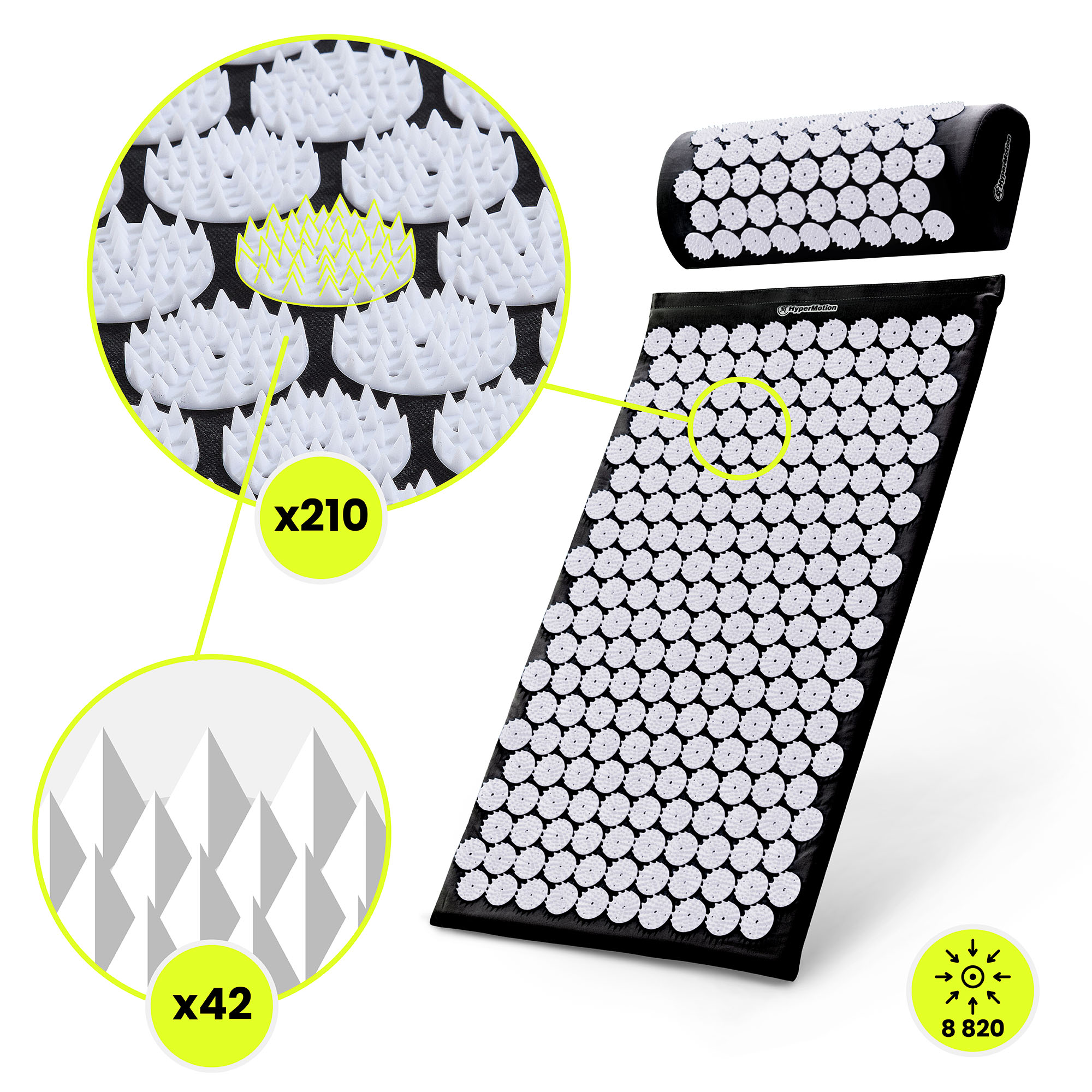 - 8 820 points de pression - 210 rosettes avec 42 pointes chacune, assurent un impact uniforme et perceptible sur toute la surface du tapis.