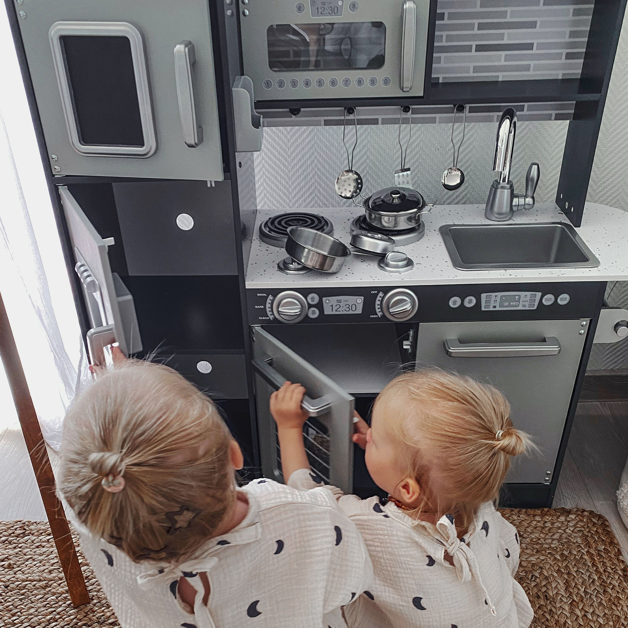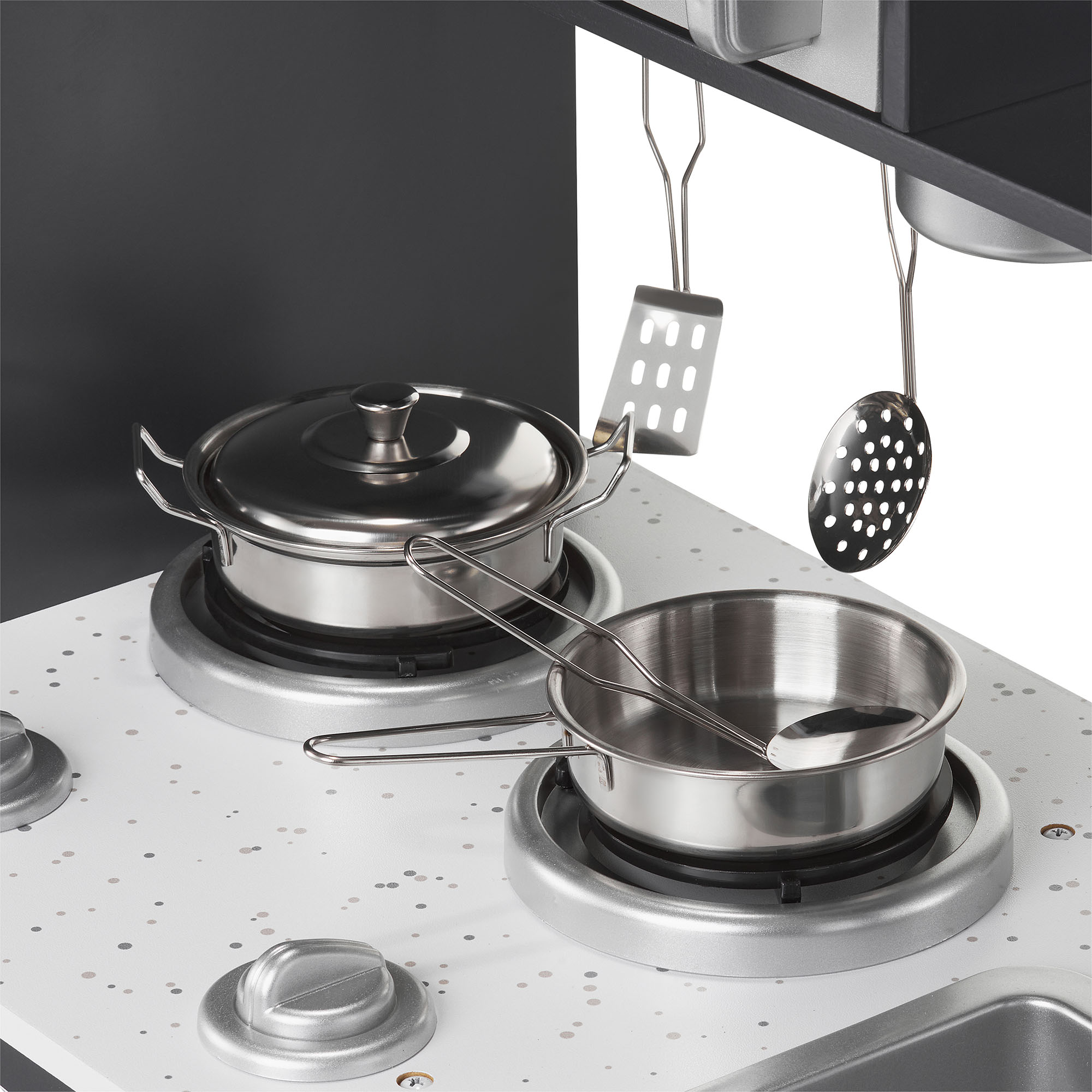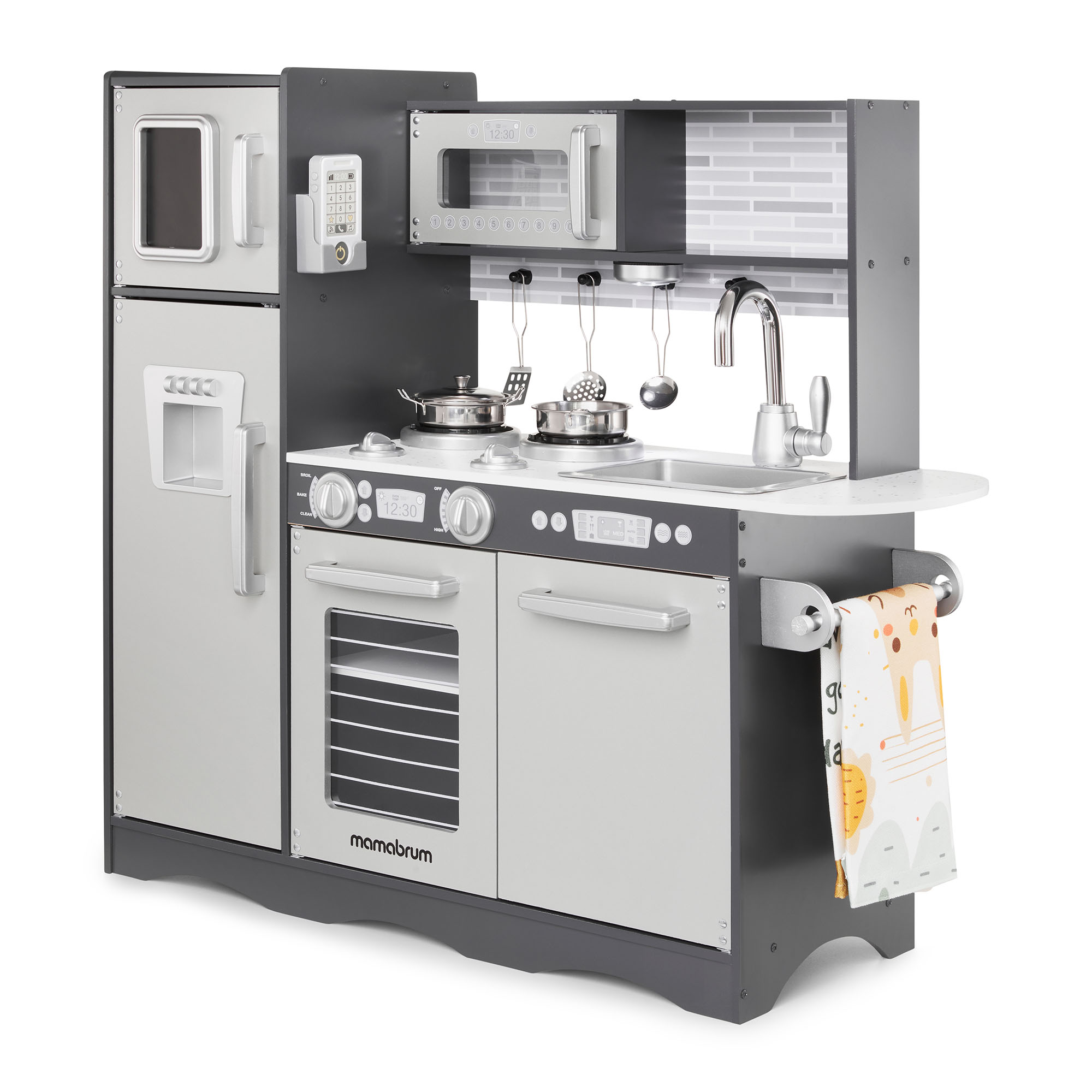 Les accessoires tels que la cuillère, la pelle et la spatule sont fidèlement reproduits de la version pour adultes. La cuisine est en bois.